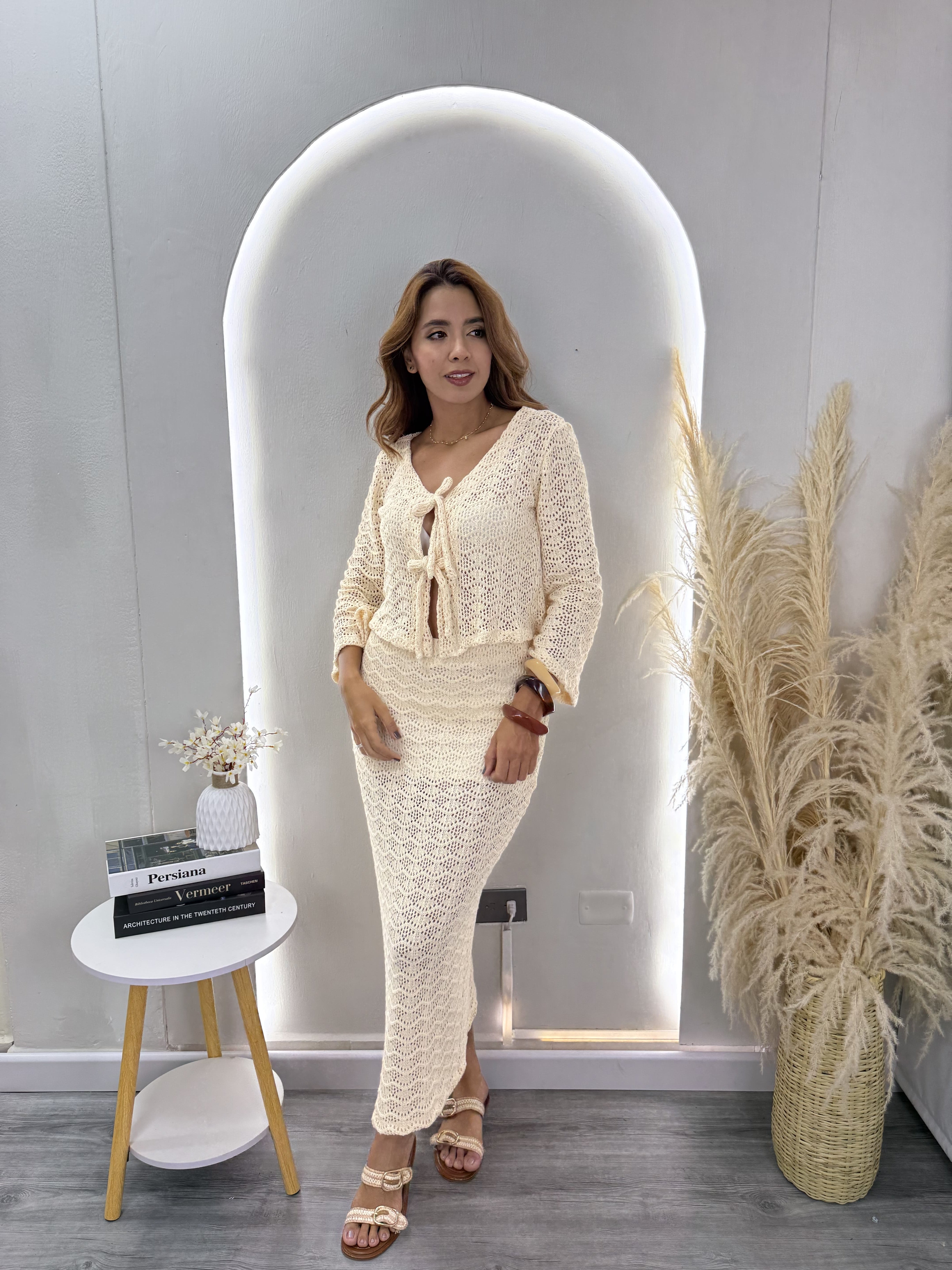 Una falda larga tejida que combina elegancia, comodidad y un diseño atemporal. Su textura artesanal aporta un acabado delicado y femenino, mientras que su forro interno garantiza total seguridad y comodidad al usarla.