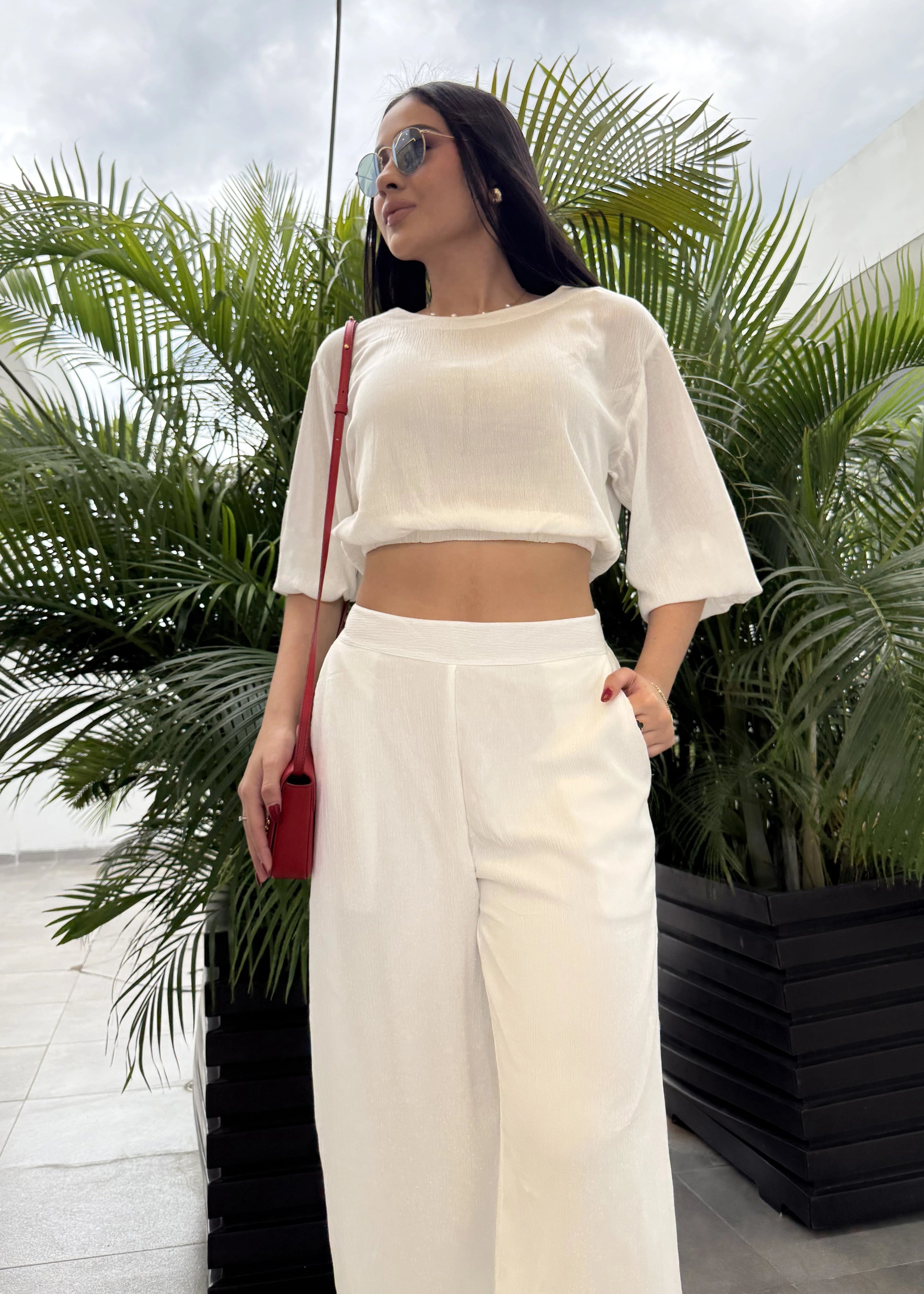 Este set es sinónimo de estilo effortless. Confeccionado en tela rayón de caída suave y ligera, combina comodidad y sofisticación para looks casuales con aire elegante. El pantalón de tiro alto cuenta con forro interno para mayor seguridad, mientras que la blusa tiene elástico en la pretina que define la silueta sin ajustar demasiado.